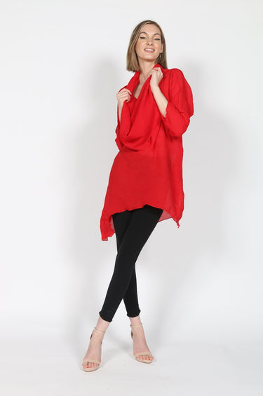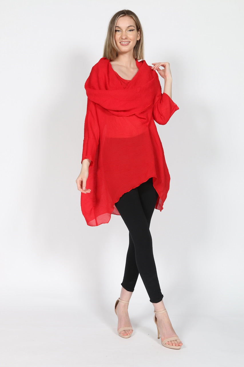 This red pleated top is expertly crafted with a beautiful light pleated fabric, providing both style and comfort. The delicate pleats add a touch of elegance to any outfit, making it a versatile piece for any wardrobe. Elevate your wardrobe with this top's unique and sophisticated design.